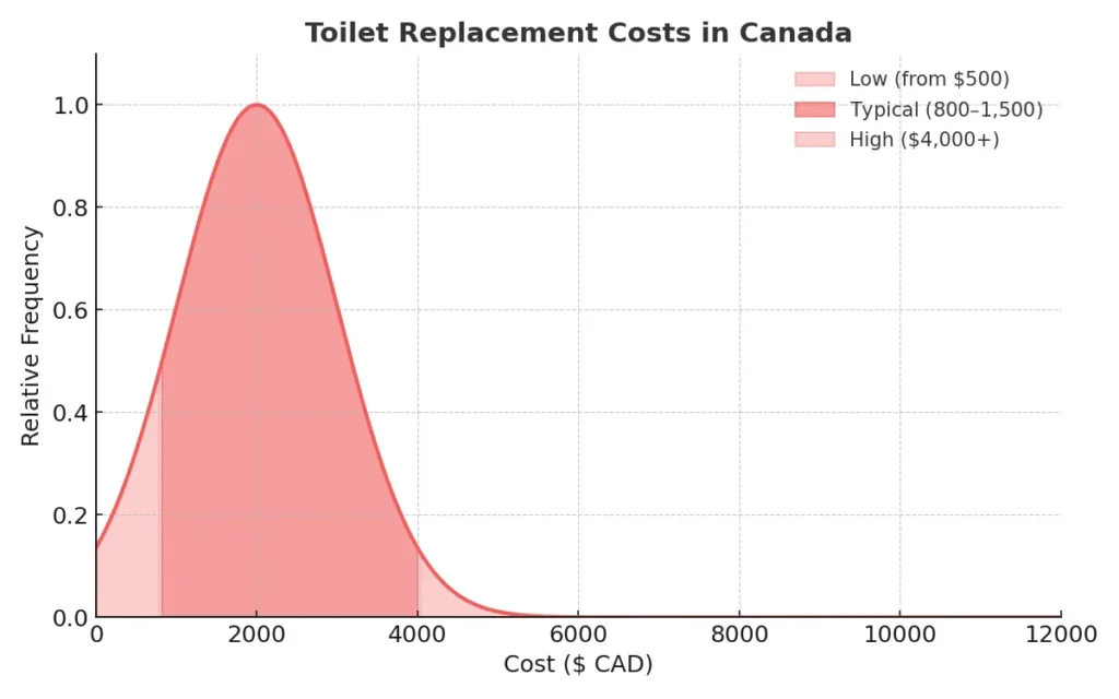 Basic two-piece replacement$500–$900Includes toilet, wax ring, braided supply line, labour, disposal